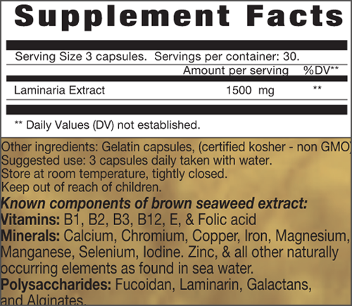Current research on brown seaweed shows that it contains all the known mineral elements found in the ocean including Iodine, Selenium, Calcium and Potassium, as well as vitamins, including B-12. BSE is known to support the thyroid gland, due to the significant amount of Iodine and Selenium it contains.